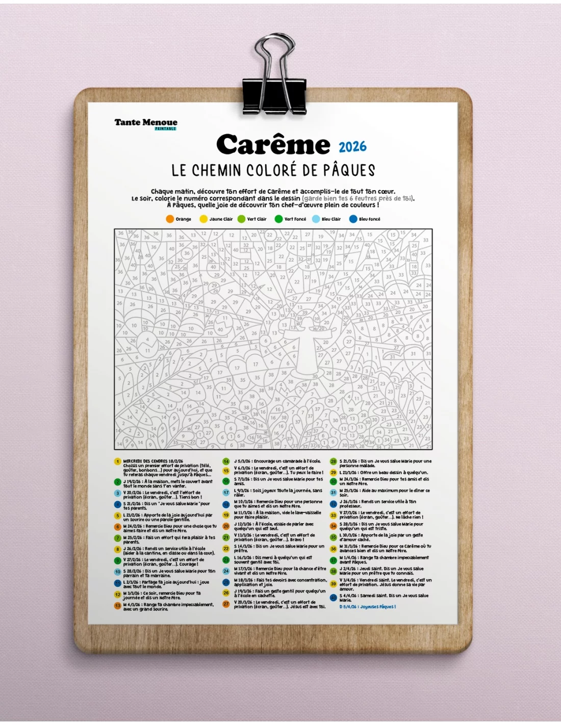 Chaque jour du Carême, l’enfant (6–12 ans) découvre un effort concret à accomplir puis colorie la zone correspondante dans un grand dessin mystère.